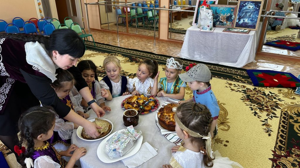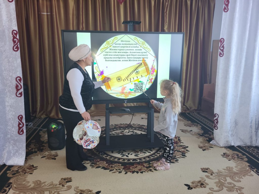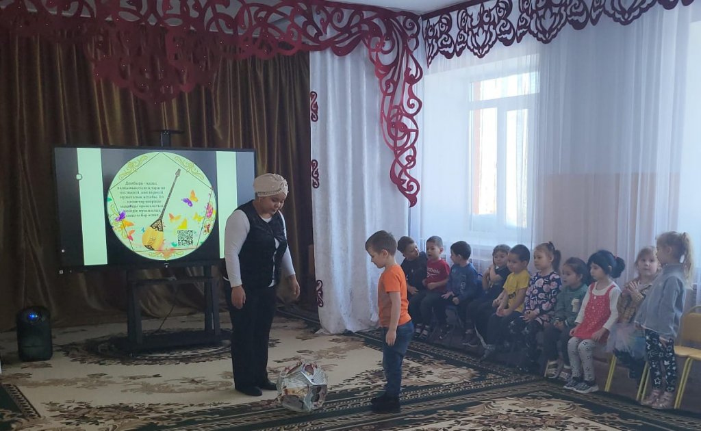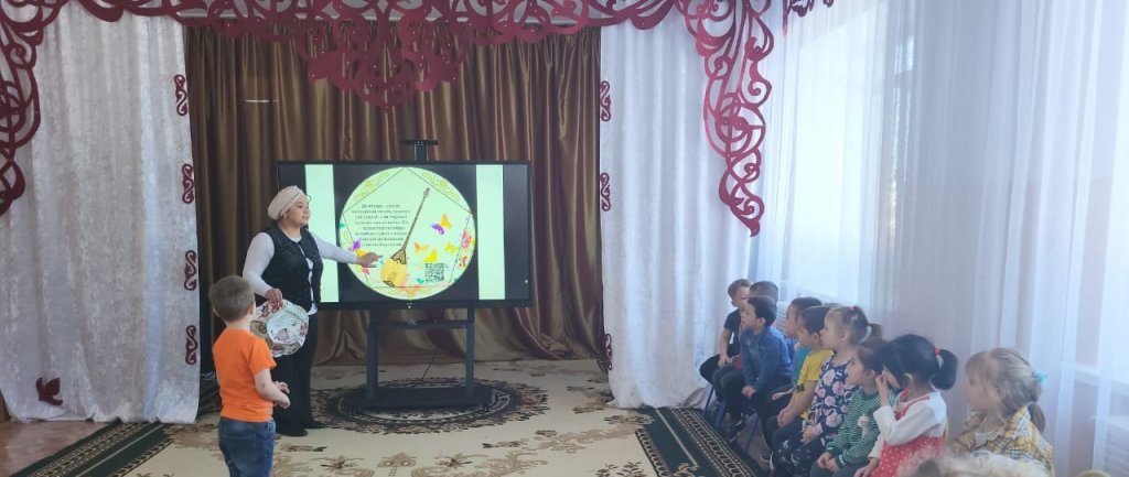 «Тілге бойлау» «Біртұтас тәрбие» пилоттық жобасы аясында ересектер тобының балаларымен музыка сабағында ұлттық аспаптарды менгеріп қазақша  сөйлеулерін дамыту  іс әрекеті өткізілді.