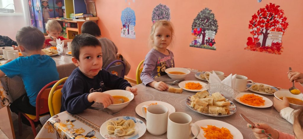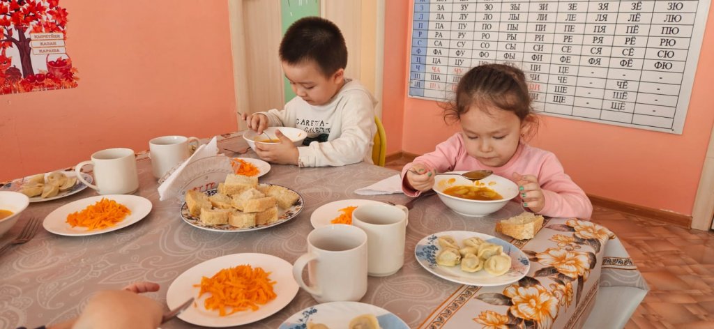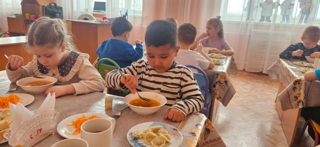 Бөбекжайымызда түскі ас мәзірі әртүрлі және балаларға пайдалы. Оған негізгі ыстық бірінші тағам, гарнир, салат және сусын - компот немесе кисель кіреді. Тағам әр баланың жасына сәйкес дайындалады және оларға белсенді күн үшін қажетті витаминдер мен энергия алуға көмектеседі